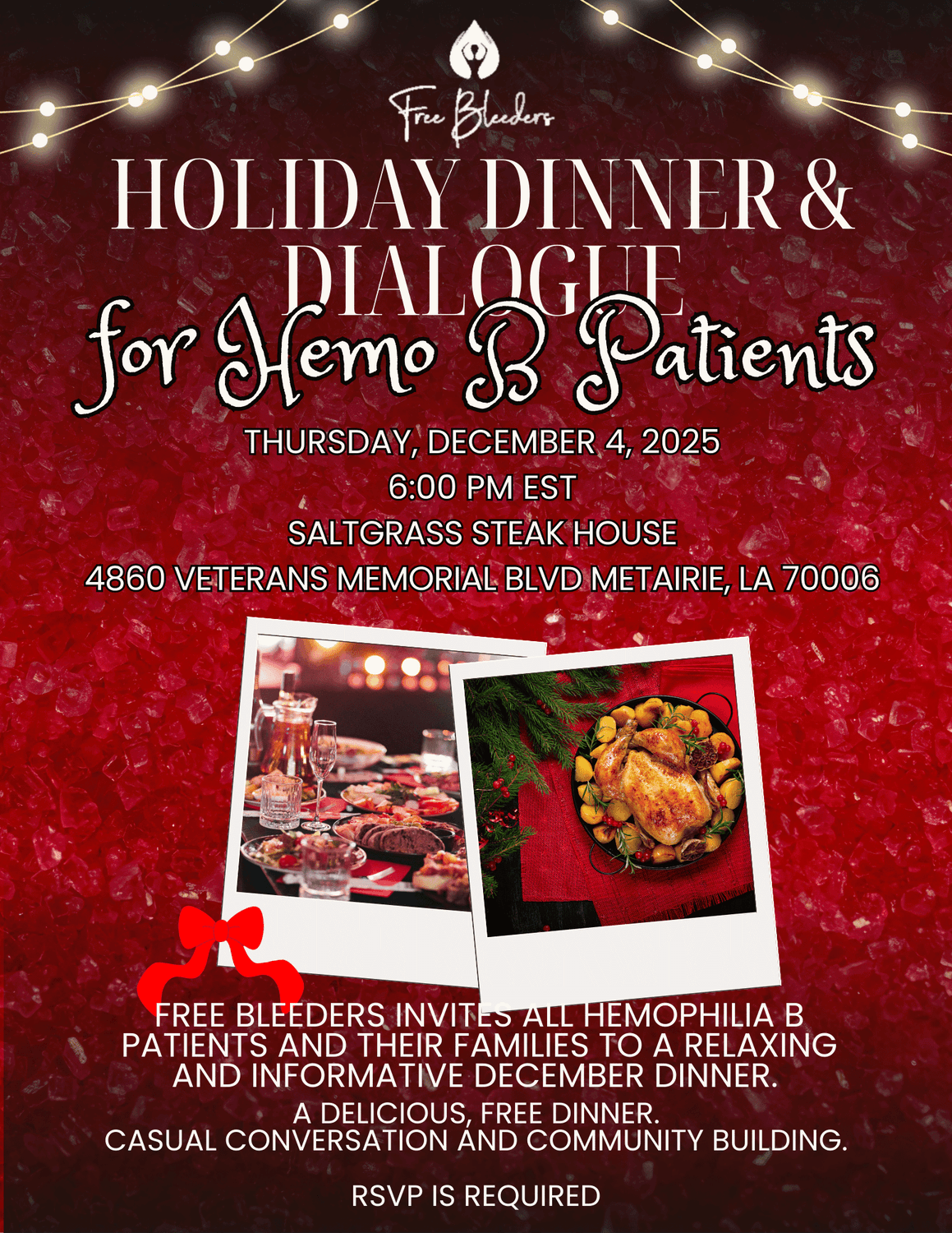 Please note that this particular dinner is hosted by Free Bleeders as a private, supportive gathering exclusively for the Hemophilia B community.